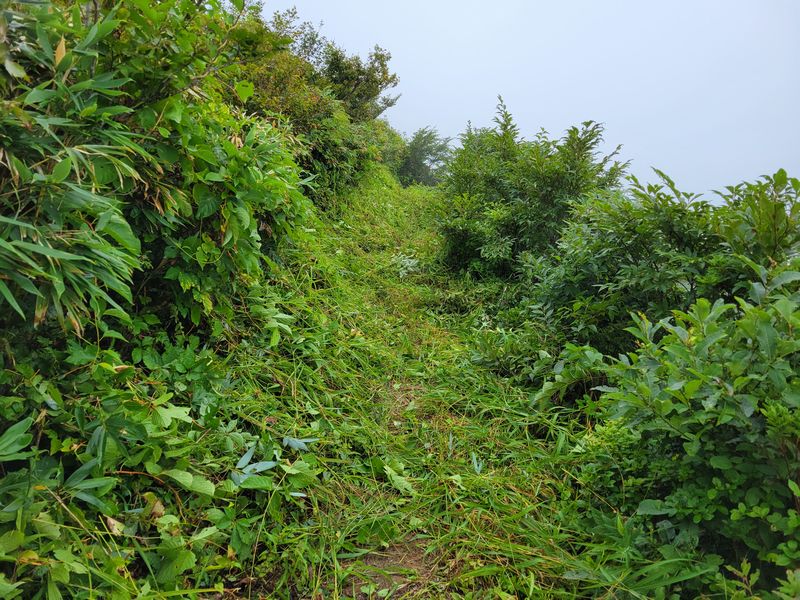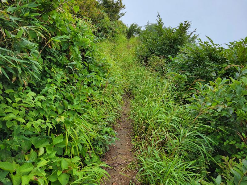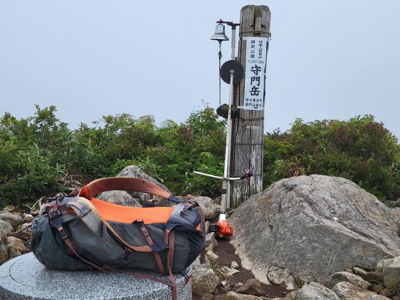 割とスムーズに刈り進み、途中2回給油と軽いメンテナンスを行い、13:00過ぎに山頂着。次の六十里登山道刈払いに向け、再び刃のメンテナンスを実施。残った食物を異に収め14:00少し前に山頂を出る。