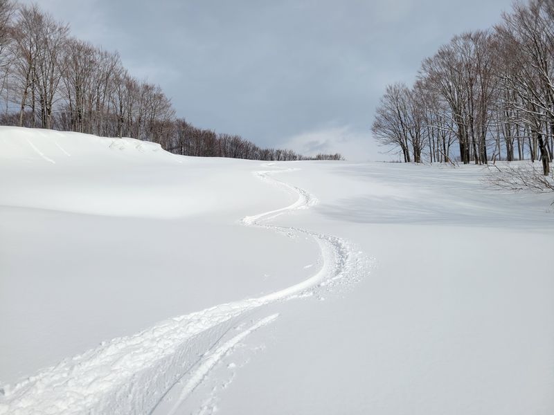 最初のツリーランは良く滑ったが、スキー場からは雪が重く難しかった。