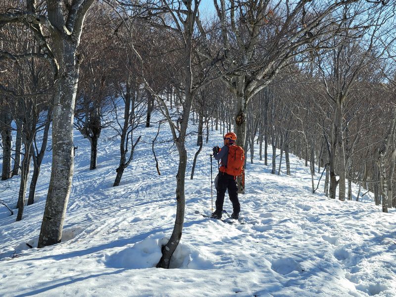 密なブナ林をやり過ごし、夏道に沿い下降。急な斜面でザラメの表層雪崩が発生し、肝を冷やす。