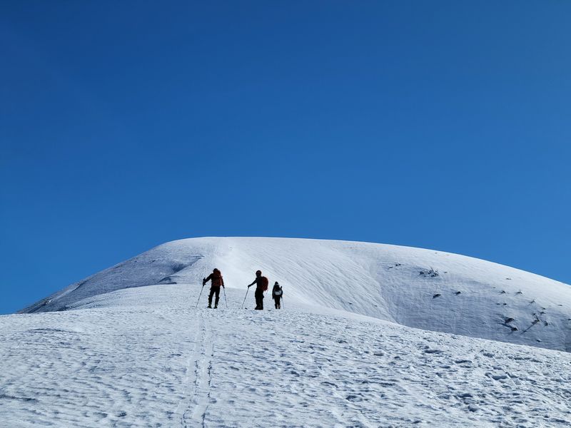 ほとんどの方が登山である。時折、スキートレースがあるので私達のほか数人がスキーヤーのようだ。