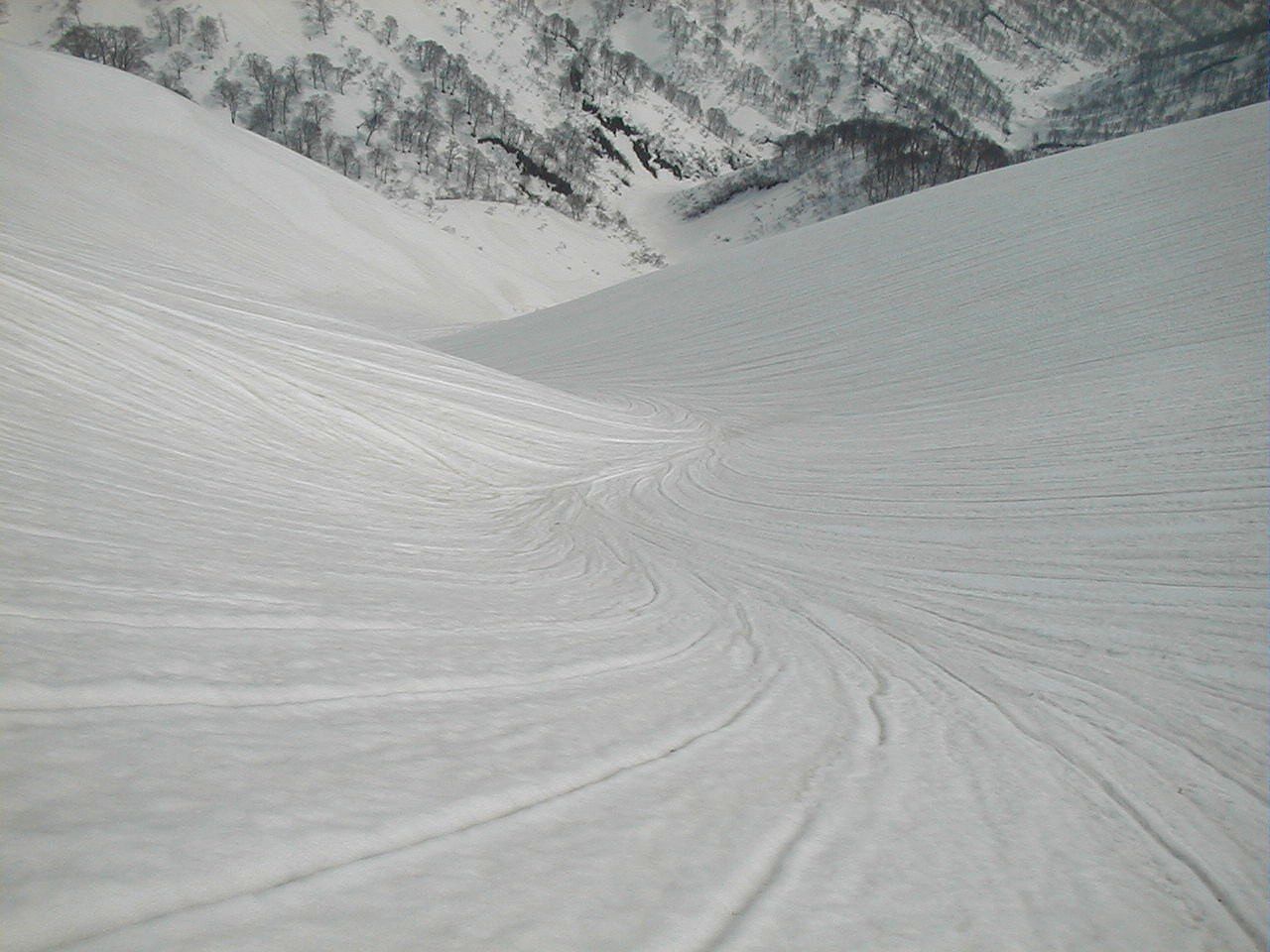二ヵ所ほど、右岸尾根からの雪庇崩落痕が見られたが、大きなモノは出ていないようだ。