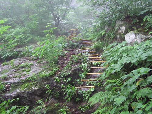 | 岩盤に打ち込まれた鉄製のステップとチェーン |