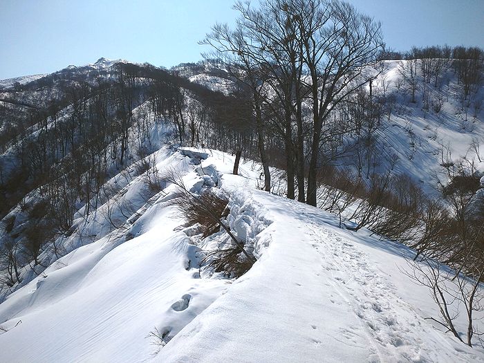 雪上に着き、登行を開始。しかし、また林道が露わになり、スキーを外す。シラベンノノ沢はわずかに雪が残り、スキーを着けたまま渡れた。その後しばらく順調に登って行ったが、尾根筋に出ると10mほど林業作業の山道が露出し、再びスキーを外す必要があった。その後、ヤジマナ尾根には雪が着いており、ずっと山頂までスキーを外さなくてよかった。