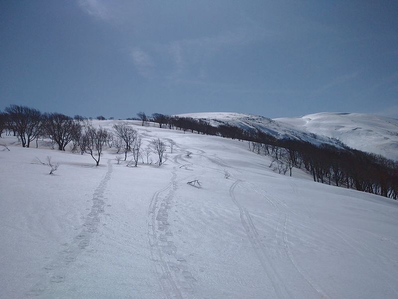 山頂で、風の通らないブッシュの下で昼食とし、とりあえず早坂尾根を滑走開始した。左沢源頭まで滑走し、しばらく登り返していたが、Y君が痙攣をおこし始めたという事で、そのまま再び滑走し林道を経由して元に戻った。