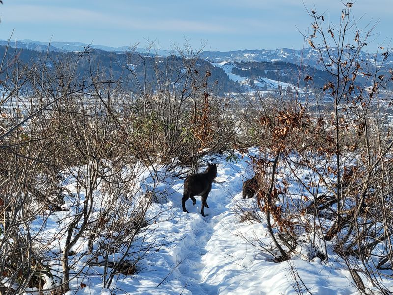 2025年12月11日 小出大力山 本日より大白川駅除雪作業員勤務が開始となり、朝の5時から午後1時までが勤務時間であった。その後天気も良いので再びトレースが十分ある大力山へと向かう。 車は1台のみ。鉄塔付近でスライドする。 帰りに5合目付近で藪から黒い生き物が移動してきたので一瞬びっくりしたが、黒っぽいカモシカの親子だった。しばらく立ち止まり、私を眺めていたので何とかスマホ撮影できた。