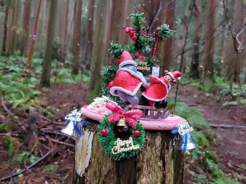 2025年12月14日 弥彦多宝山 雨予報なのであらかじめ雨具を着こんで歩き始めたが、さほど雨は降らず再び脱ぐのも面倒くさいので着たまま歩く。しかし暑い。そして当然ペースは上がらず。 9合目から多宝山へ。天候は強風となり誰もスライドはなかった。ひたすら我慢大会のような山歩きを堪能した。 下山路にクリスマスのオブジェがあったので撮りこんだ。