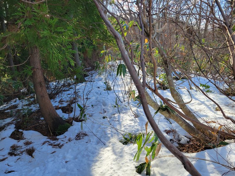 主に積雪期に、尾根続きの談合山~尖り山~城山を縦走するパターンが一般的である。5年前に城山に登ったが、雪のない時期であった。今回は雪は多少あるもののほぼ無雪期に近い雪の量であり、本来の藪山を楽しめた。ダイレクトに崖のような地形から登ることも楽しいと思えたが、オーソドックスなコースを登った。ただ、山頂付近は標高の高低が今一つ理解できず、右往左往してしまった。うまくヤマップを使いこなせていない証拠だ。
