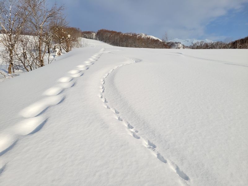 午後は所用あり。天気は下り坂ということで近間の旧大原スキー場から登る。昨日あたり、遊んだ形跡あり。