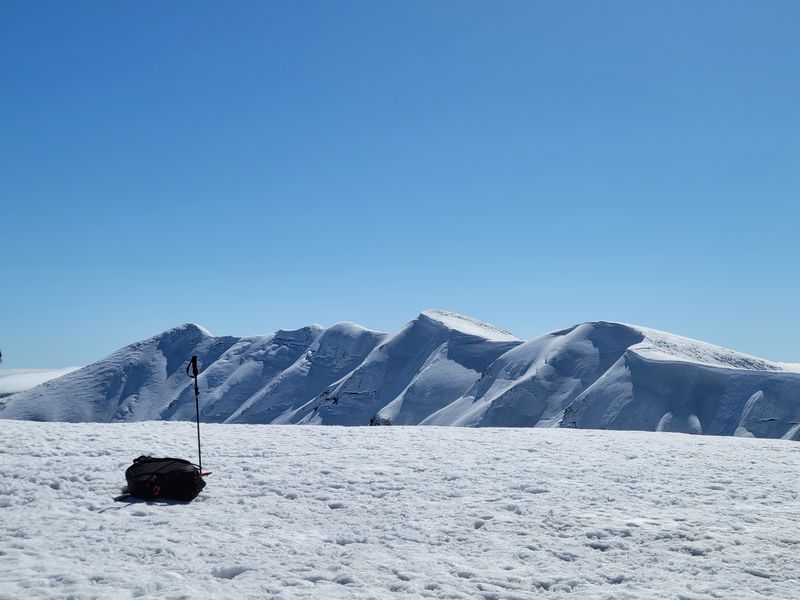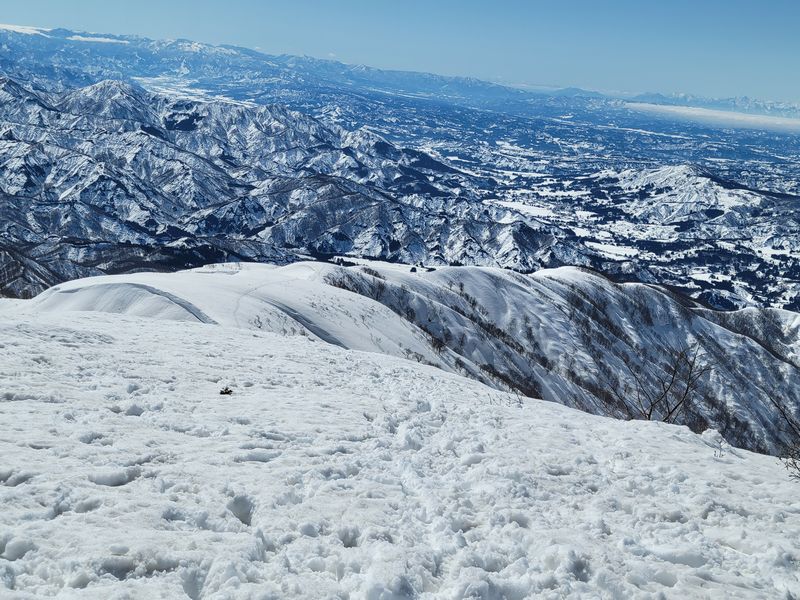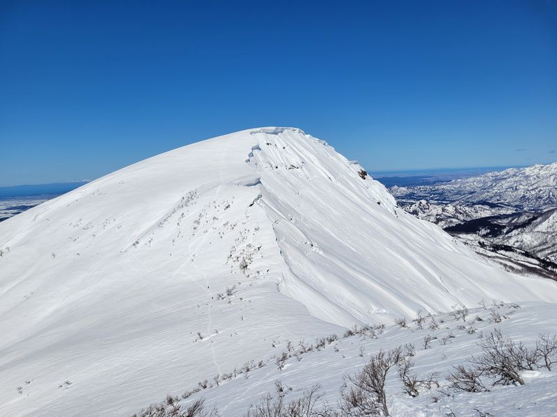 私とHさんはシールを外し鞍部の網張に下降し始めたが、思いの外急であった。ザクレ雪なので、アルペン滑りで制動しながら下ると、ザラメがなだれてしまう。下方には登山者が横切っているため、横にトラバースし、鞍部に滑り込んだ。