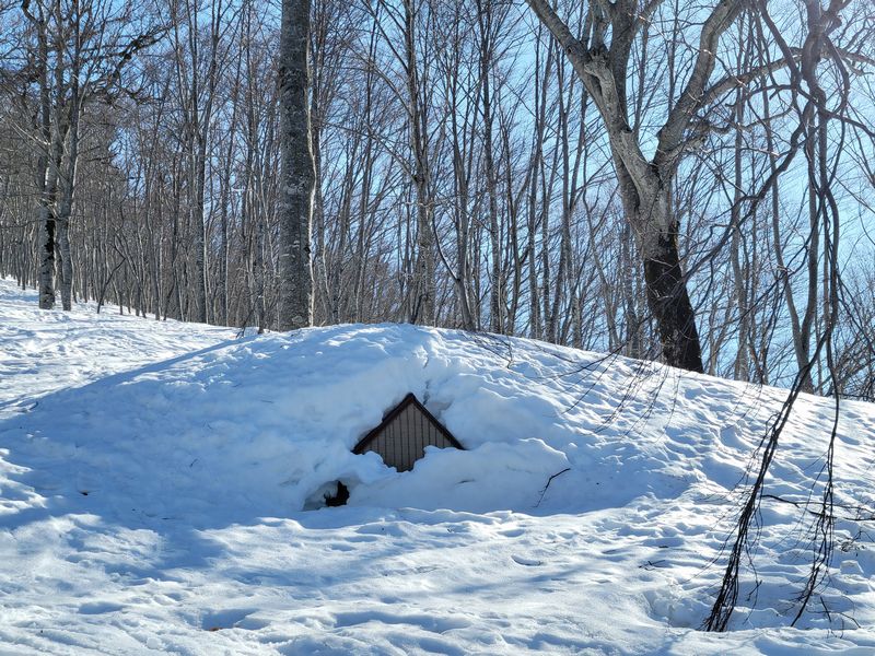 密なブナ林をやり過ごし、夏道に沿い下降。急な斜面でザラメの表層雪崩が発生し、肝を冷やす。